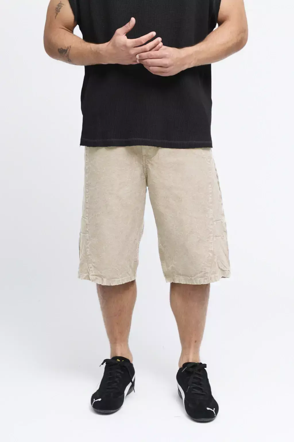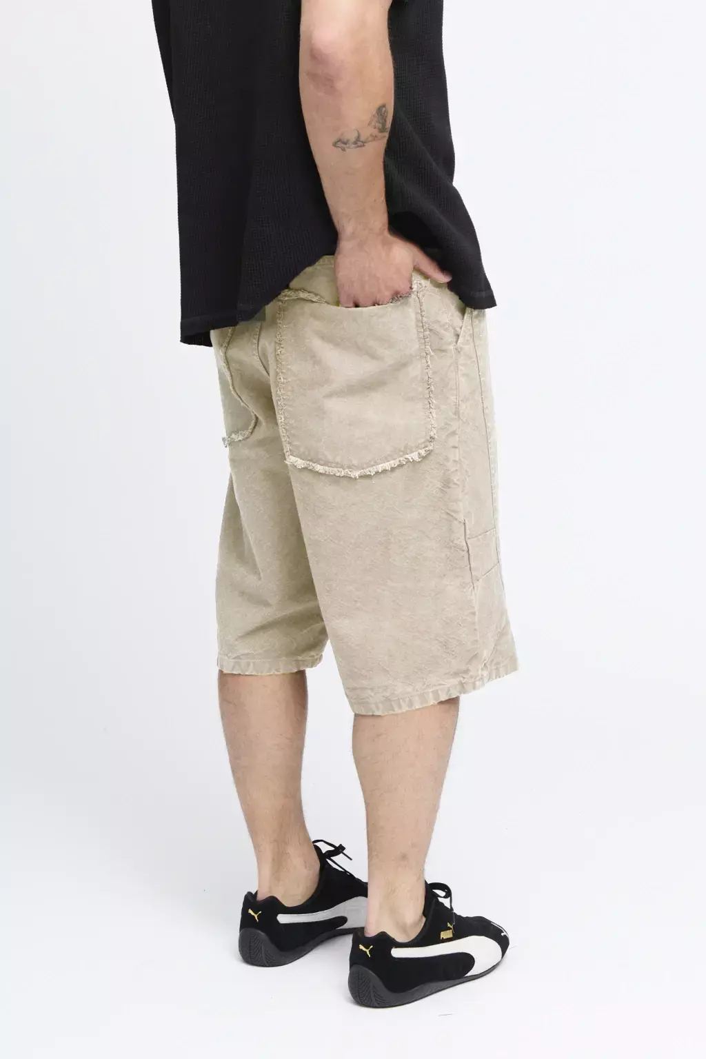 Bermuda baggy con recortes y pinzas laterales, bolsillos traseros amplios y desflecados. El modelo mide 1,83 y está usando talle M.