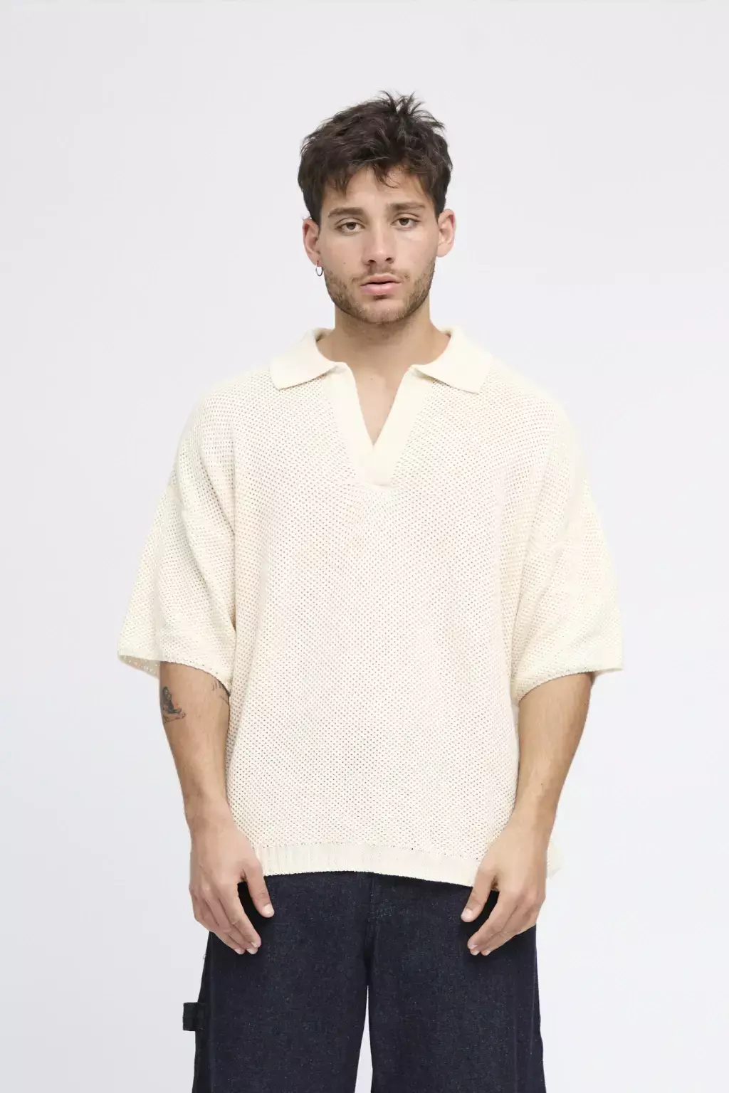 Polo de manga corta, tejido con un hilado premium de algodón. De calce boxy, con cuello camisero tejido y cartera sin botones.