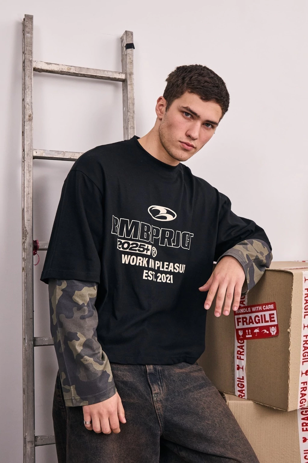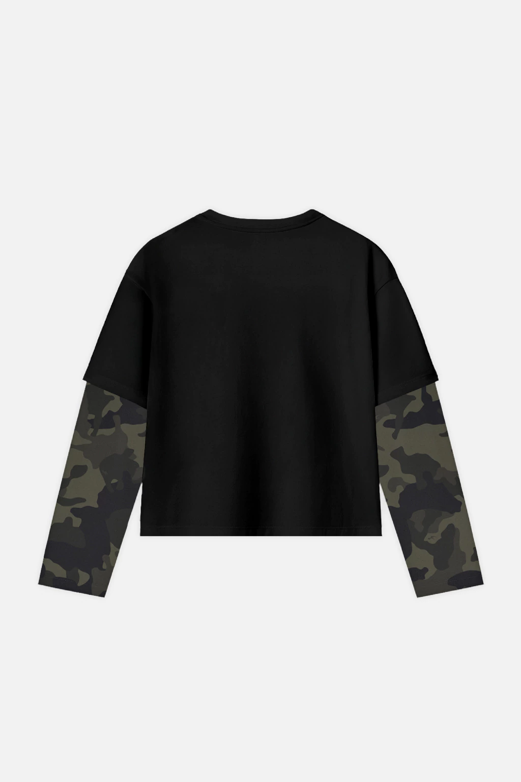 • Remera negra con doble manga camuflada. Estampa en frente y manga. Detalle de etiquetas marcarias tejidas en el lateral.